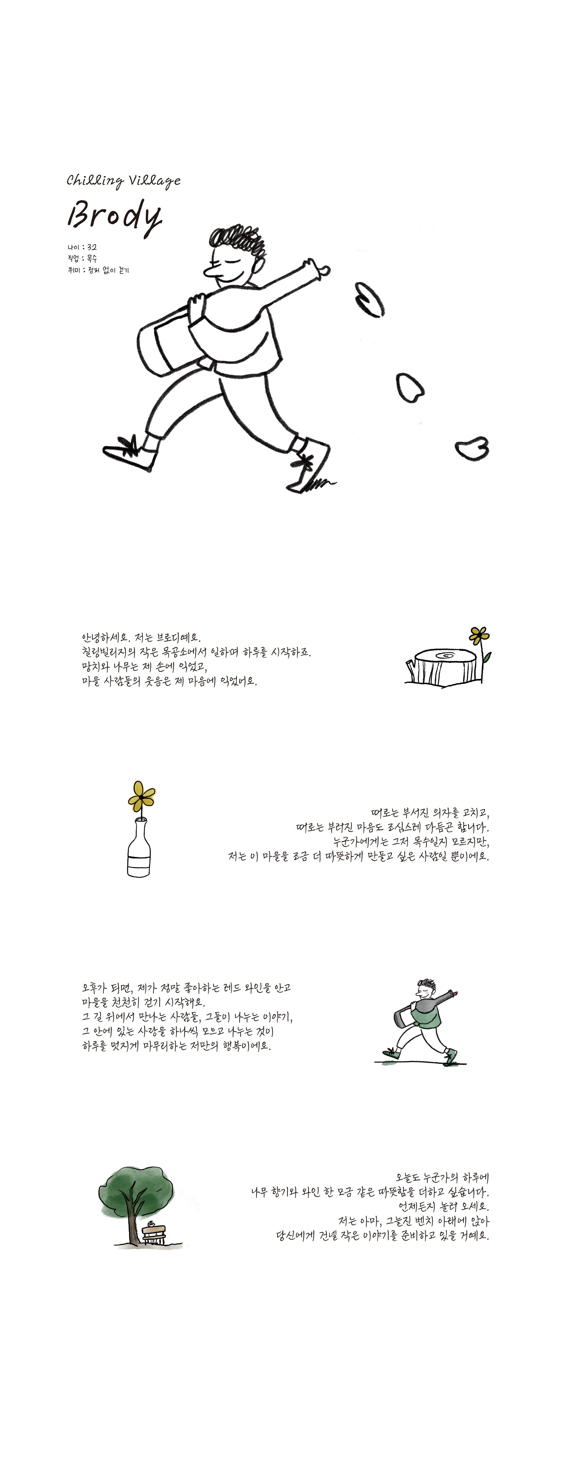 안녕하세요, 저는 브로디예요. 칠링 빌리지의 작은 목공소에서 일하며 하루를 시작하죠! 망치와 나무는 제 손에 익었고, 마을 사람들의 웃음은 제 마음에 익었어요.